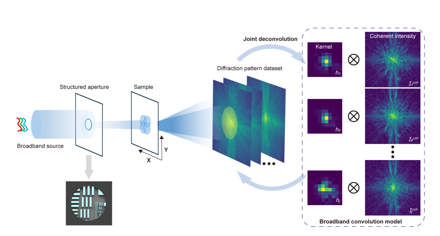 叠层扫描相干衍射成像(Ptychography)是一种高效的无透镜显微成像技术,可适用于X射线和电子显微镜领域。因卓越的成像性能吸引了材料科学和生物学领域的广泛关注。然而,该技术对光通量和相干性的高要求使其应用主要局限于同步辐射等大型设施。近年来,研究团队致力于将该技术推广至实验室光源,重点解决桌面光源所固有的低时间相干性(宽谱)和光通量不足等挑战。在本研究之前,处理宽带光源的数值方法主要基于非色散样品的理论假设,然而实际情况中大多数样品在宽带照明下表现出色散特性,导致原有算法模型失效,难以重建高质量图像。