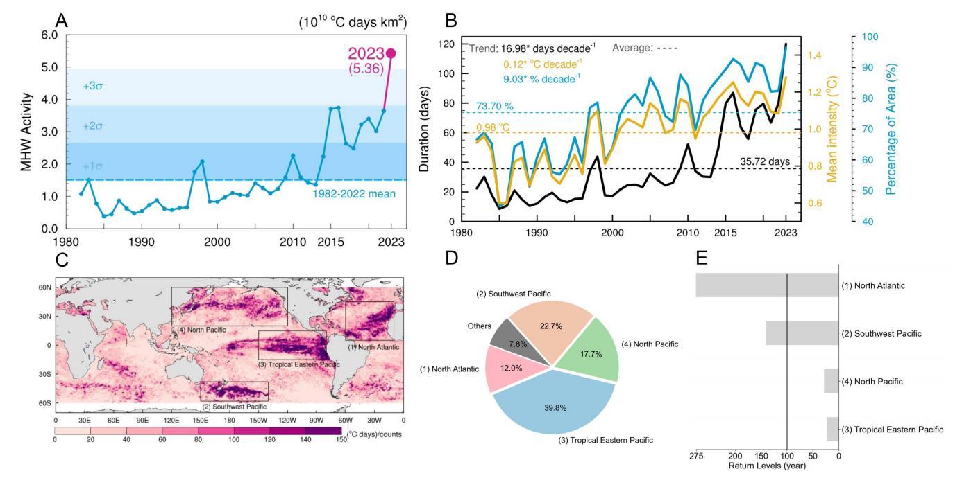 图1 2023年海洋热浪总活动强度创纪录,多个关键海域远超百年一遇极端水平