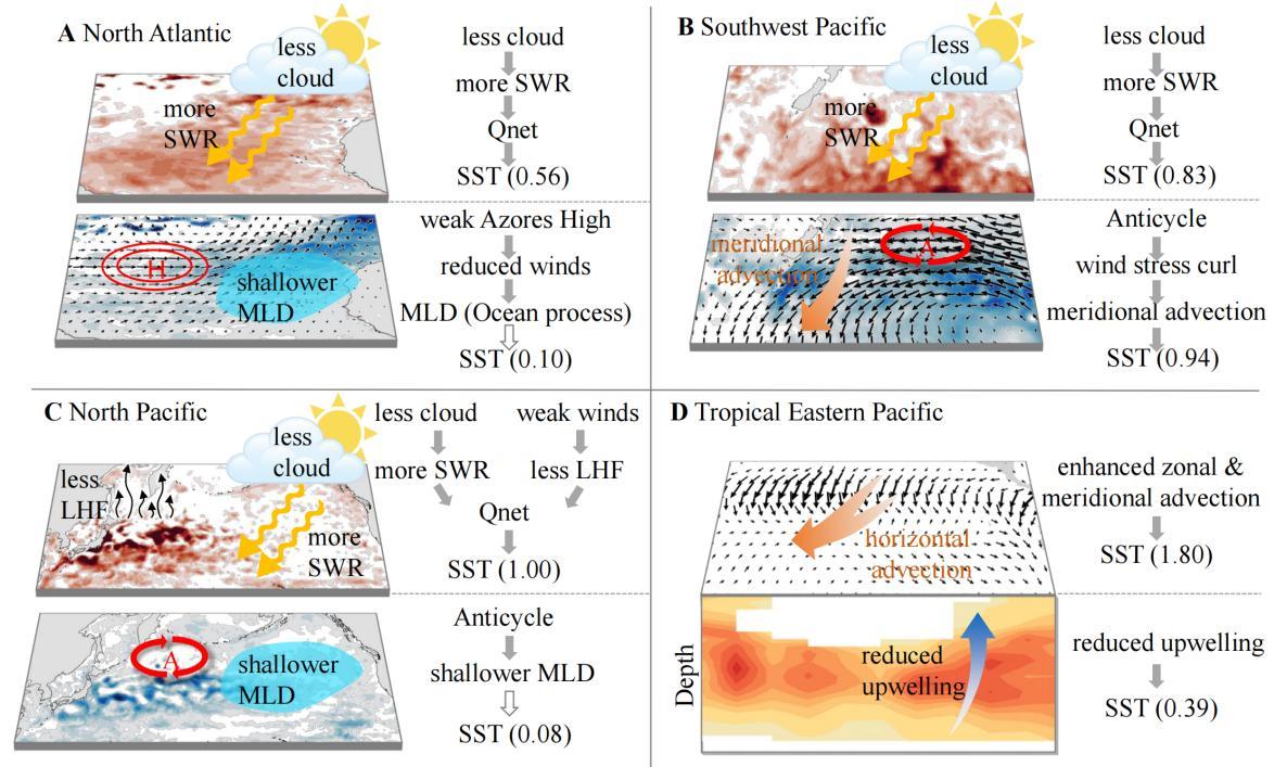 北太平洋:短波辐射增强与潜热损失减少共同作用,叠加变浅的混合层,致使海面迅速变暖;