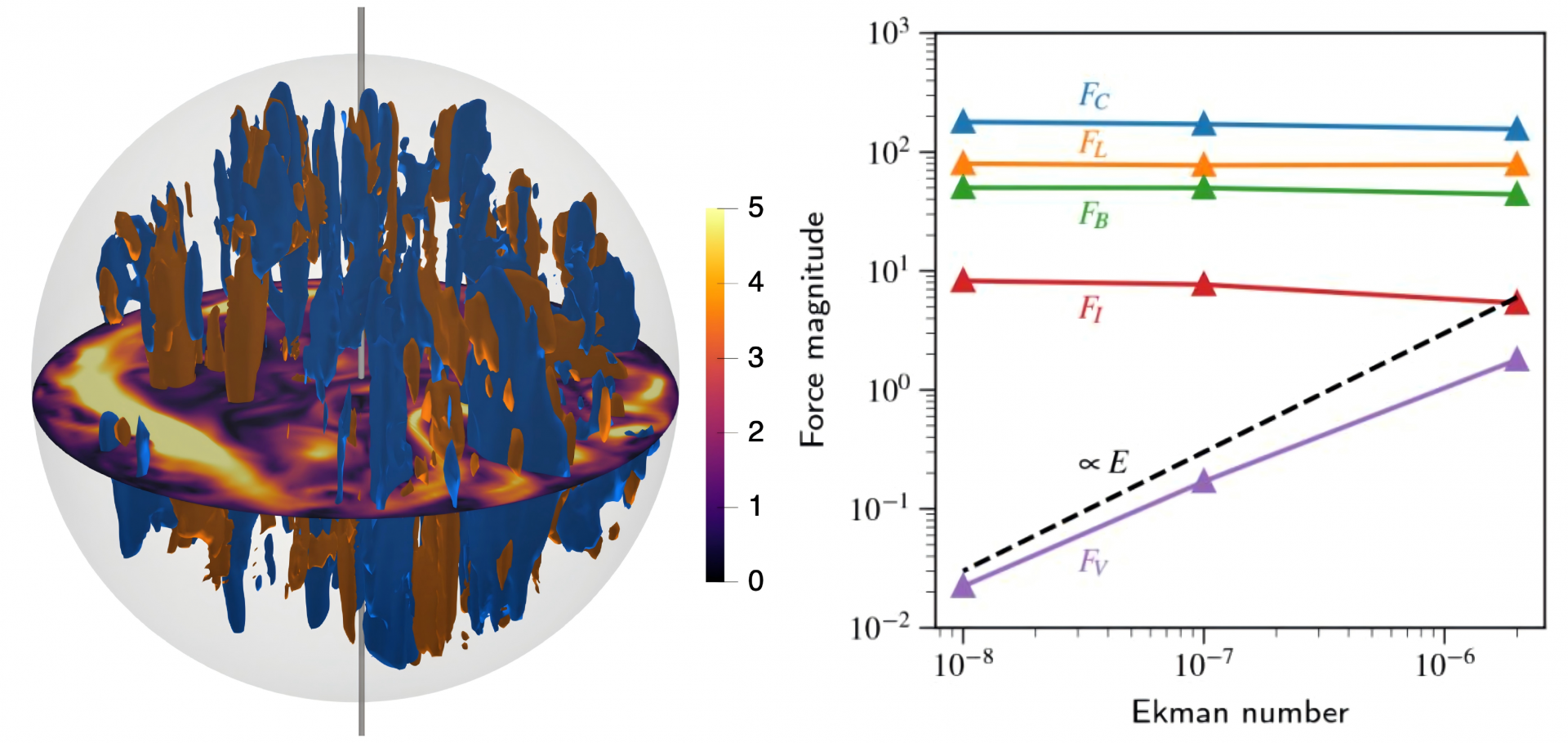 研究团队进一步深入分析了极低黏度发电机模型的力平衡关系。分析结果表明,地球自转产生的科里奥利力在形成沿自转轴的柱状对流结构方面起主导作用;洛伦兹力在整体上与科里奥利力量级相当,但在强磁场区洛伦兹力会超越科里奥利力,进而破坏局部柱状结构(图2)。通过对洛伦兹力的轴向力矩定量分析表明,该模型近似满足J.B.Taylor 在1963年所提出的忽略黏性力的理论约束,进一步验证了研究构建的地球发电机数值模型达成了无黏发电机模式。