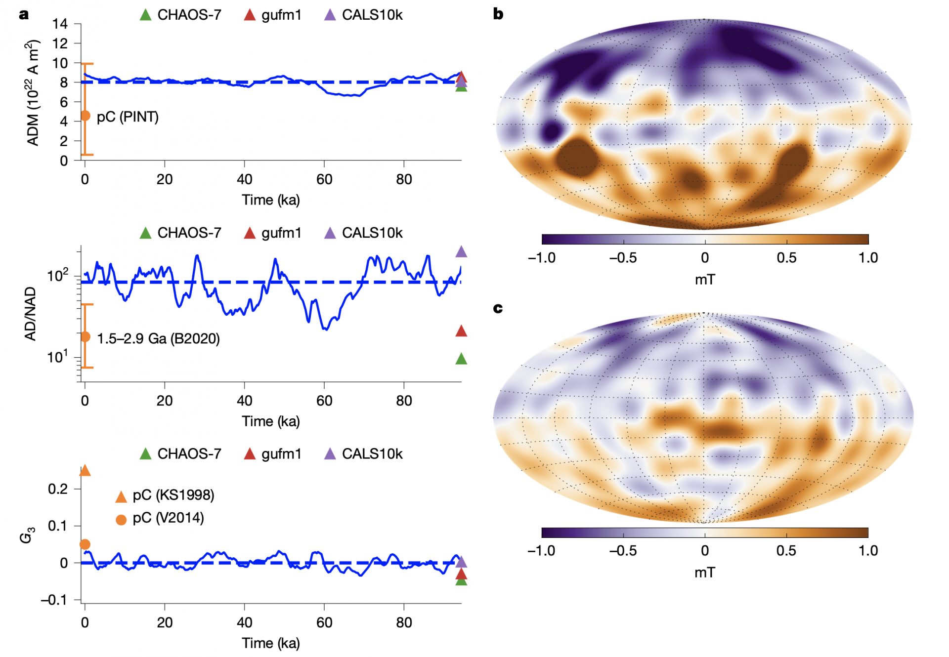 研究团队最后将模拟结果与地磁观测数据进行了系统对比分析。研究采用轴向偶极矩、偶极/非偶极比和磁能谱等关键参数进行定量分析,结果表明早期地球模型产生的磁场特征与前寒武纪古地磁记录总体上吻合,同时还能重现与现今观测相似的地磁场结构和强度(图3)。这一发现表明地球发电机能够在数十亿年的时间尺度上维持以轴向偶极子为主的稳定地磁场,为古地磁场的重构以及理解地球磁场的长期演化提供了重要理论依据。