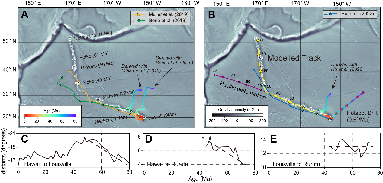 图1.夏威夷热点西向漂移的论证。(A)使用了不同的绝对板块重构模型反推出来夏威夷热点漂移轨迹。(B)利用数值模拟获得的太平洋板块运动结果反推的夏威夷热点轨迹和假设太平洋板块不旋转的情况下反推的夏威夷热点轨迹。(C)-(E)过去80百万年期间太平洋板块上不同火山岛链(夏威夷、路易斯维尔、鲁鲁图)上相同年龄火山之间的经度距离变化。负号表示前者在后者的西边,数值表示经度距离。