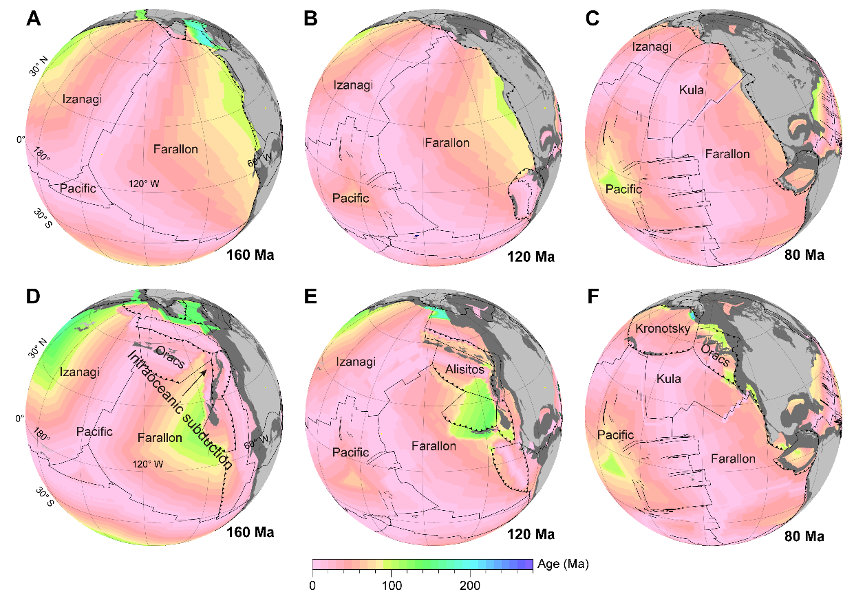 图2.传统的“安第斯”型板块重构(上)和包含东北太平洋洋内俯冲系统的板块重构(下)。