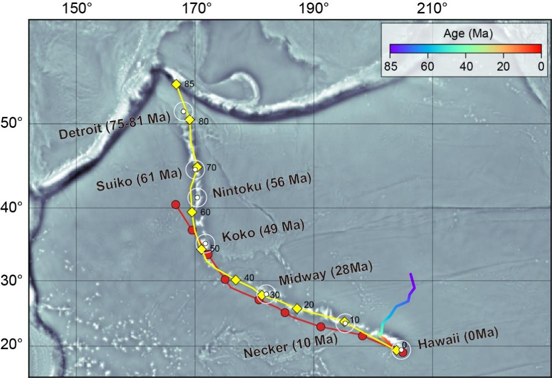 夏威夷-帝王海山链是北太平洋最显著的地质构造之一,其形成机制的研究催生了地幔柱理论。1963年,威尔逊曾提出假说,认为这些板内火山是由一个静止不动的热点侵蚀太平洋板块所导致,而太平洋板块在热点上方的运动则形成了一连串火山(即夏威夷-帝王海山链)。Morgan在70年代进一步发展该理论,提出这些热点源于地幔深部狭窄的热上涌,从而提出了地幔柱理论。尽管这一理论可以解释海山链的形成,但夏威夷-帝王海山链的一个显著特征——约在4700万年前(47Ma)形成的近60°弯折——至今尚未得到完整解释,这一现象长期被视为地球动力学领域的未解之谜。