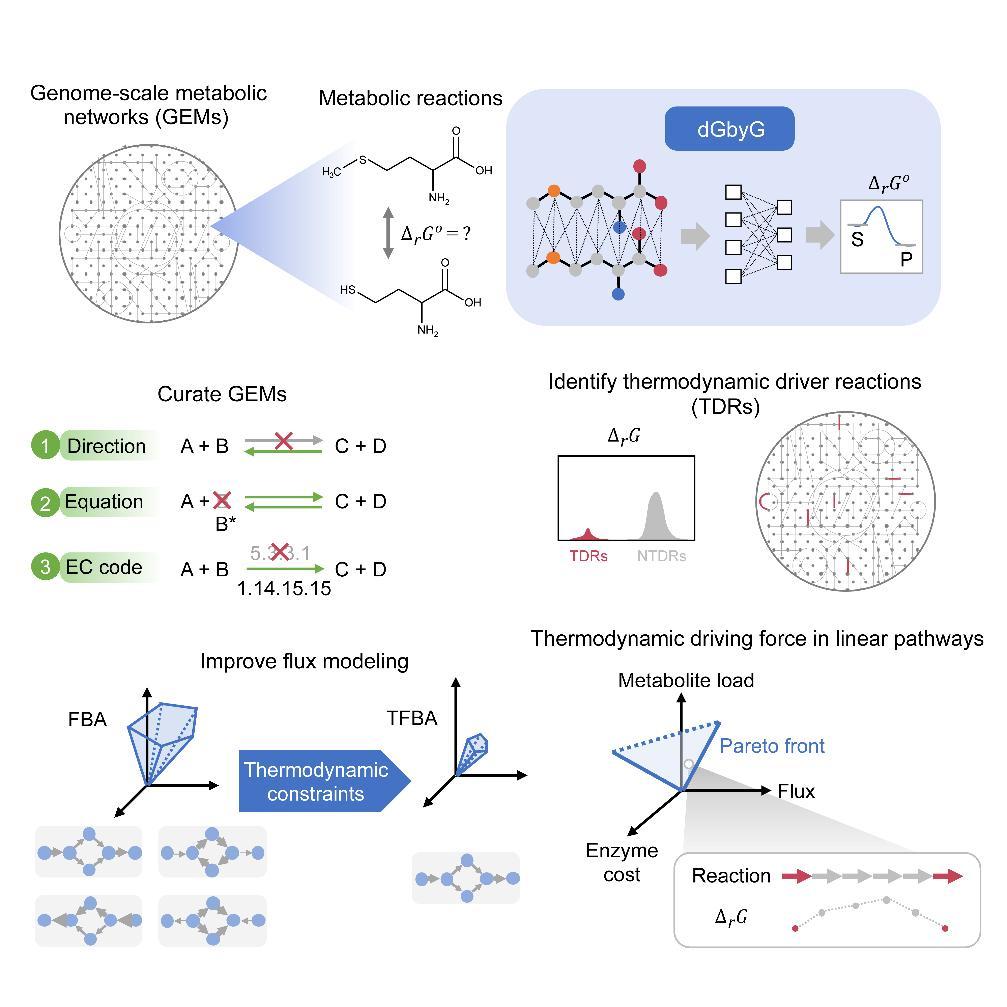 “生命以负熵为食”强调了热力学第二定律在生命活动中的重要作用。在宏观层面上,热力学定律约束了生命过程的可能性,而在新陈代谢过程中,热力学定律也决定了生理条件下代谢反应发生的方向,以及代谢通路的调控模式。代谢通路的控制模式与通路中代谢反应的吉布斯自由能分配高度相关,例如在糖酵解通路中,关键调控酶HK、PFK和PK催化的反应具有较负的吉布斯自由能变,从而成为整个通路的关键限速步骤。21世纪以来,随着高通量测序和全基因组代谢网络建模方法的发展,全基因组代谢网络(GEM)已经成为代谢研究的标准技术工具。一个物种的GEM通常包括数以千计的代谢反应,但现有实验数据和预测方法仅能提供少数代谢反应的标准吉布斯自由能,使得在全基因组水平上研究代谢网络的热力学特性和控制模式极为困难。